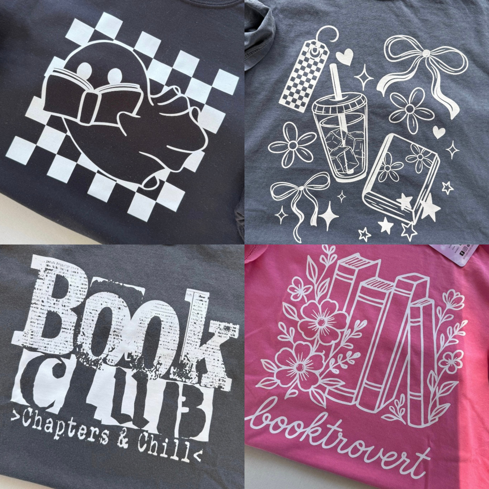 Calling all book lovers do I have the shirt for you. Each shirt is pressed in house using an industrial heat press. The design is a DTF print or a screen print transfer which you can feel on the surface of the shirt.